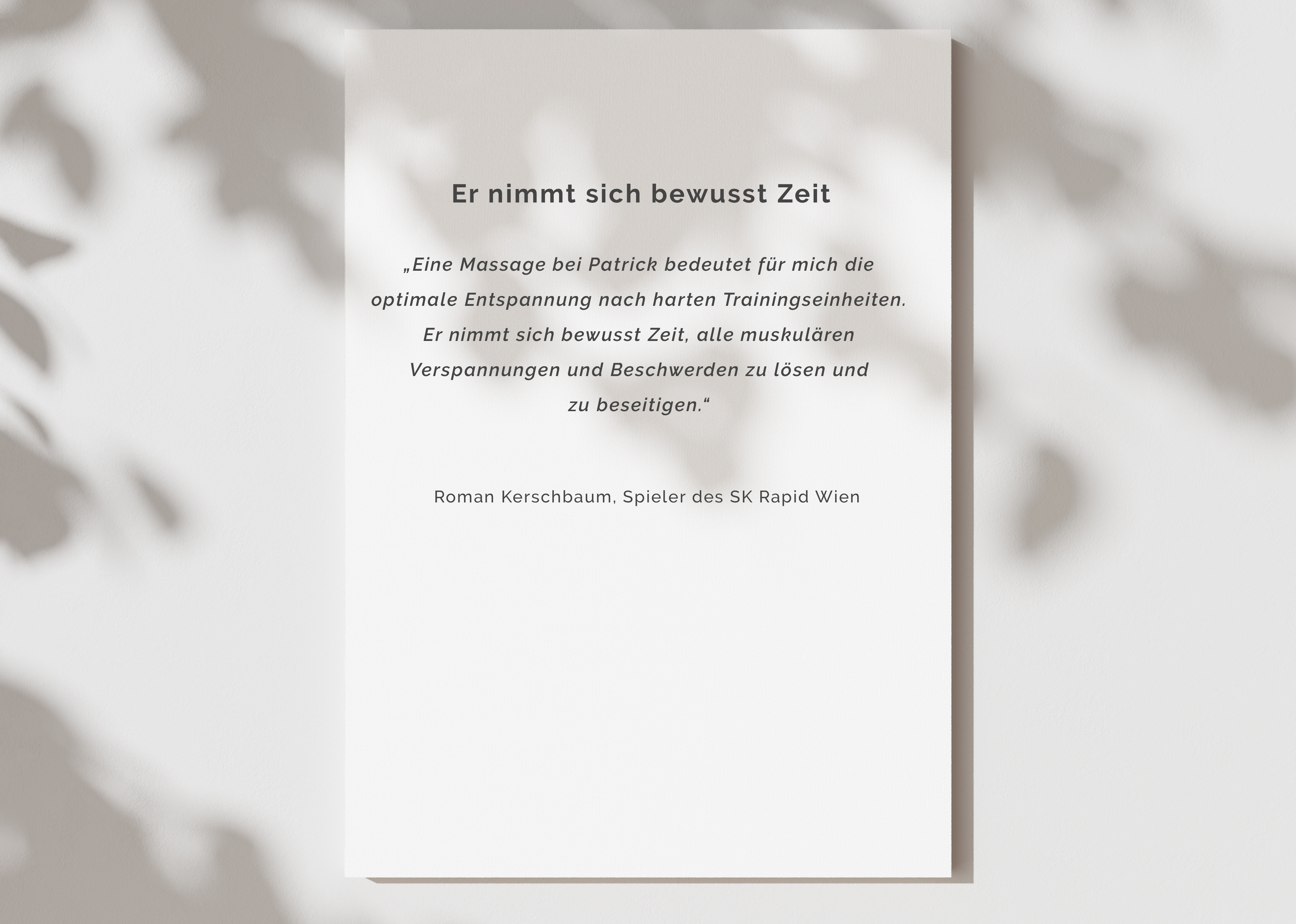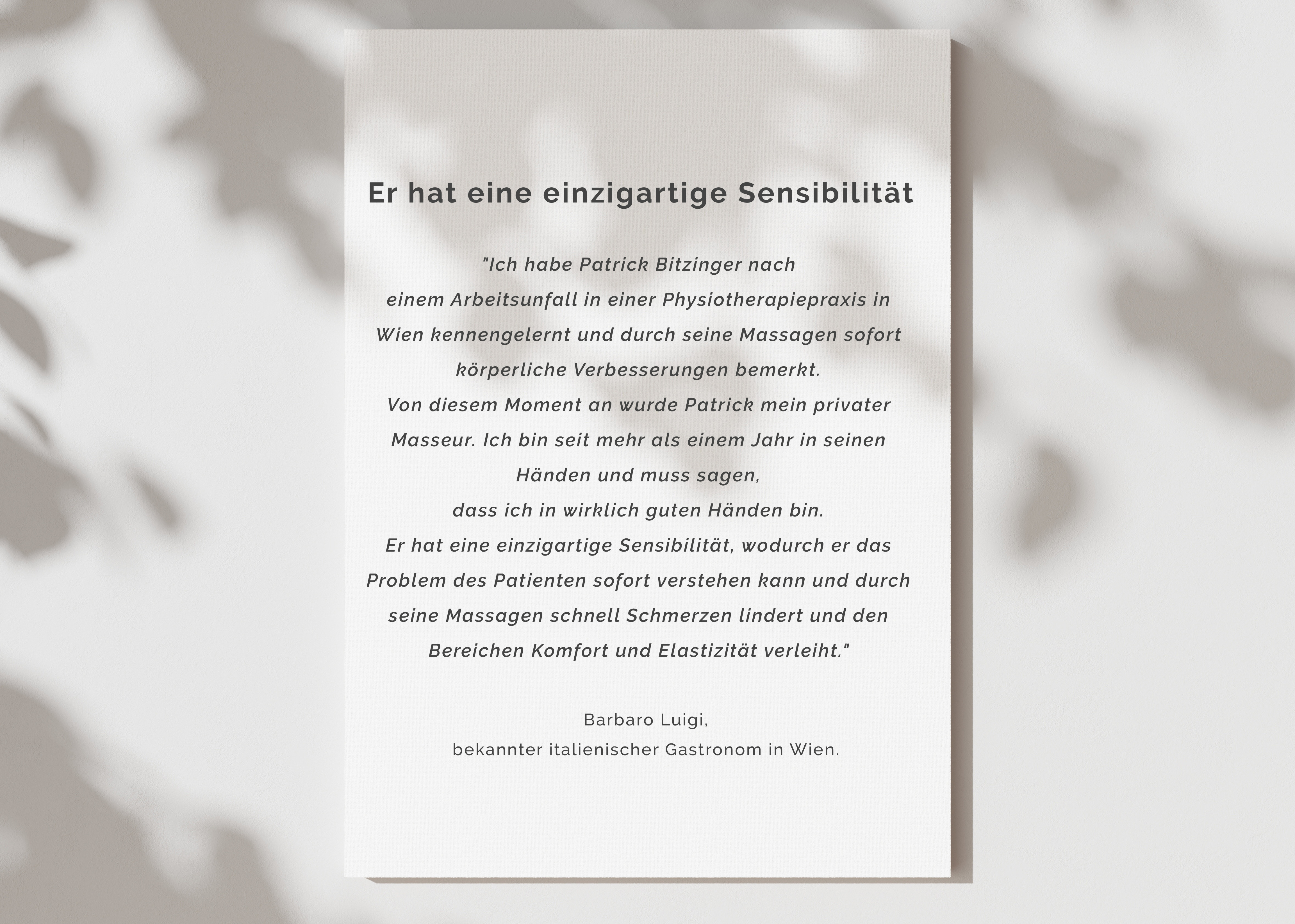 Mein Name ist Patrick Bitzinger und ich praktiziere die Heilmassage in 1090 und 1220 Wien. Meine Schwerpunkte sind die Heilmassage, Sportmassage und die Lymphdrainage. Zudem biete ich Heilmassagen auf Wahlbehandlung oder mit einer ärztlichen Verordnung an.